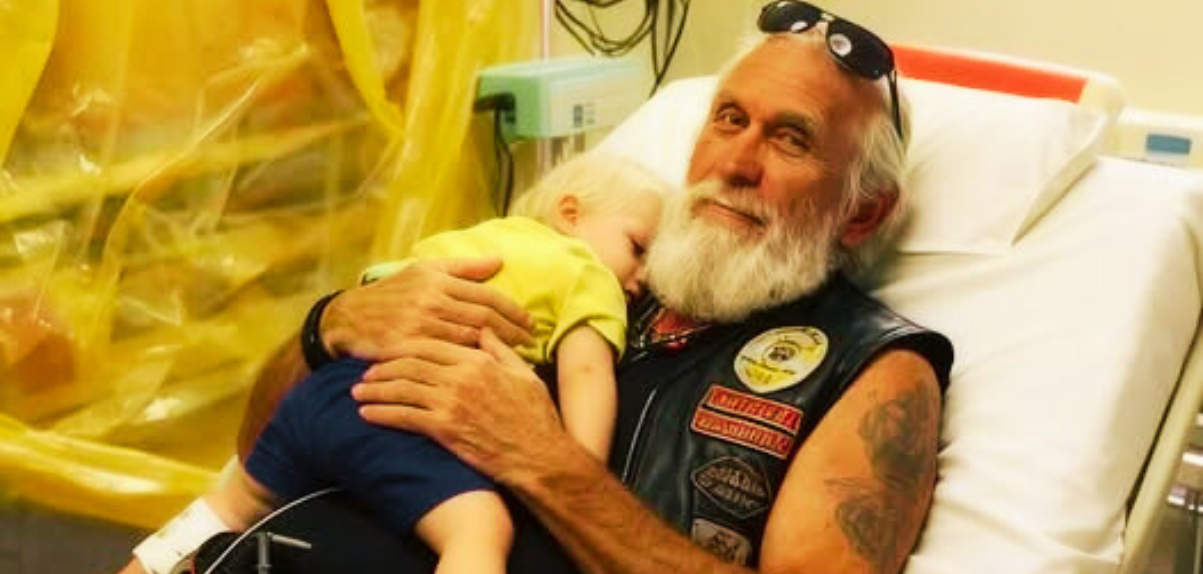 DEEL NU: LEES | Een zieke biker besloot een huilende peuter zes uur lang troost te bieden in plaats van zijn geplande chemotherapiebehandeling bij te wonen.
