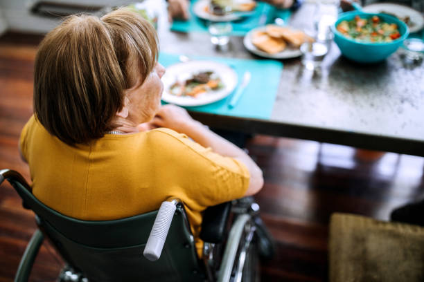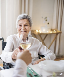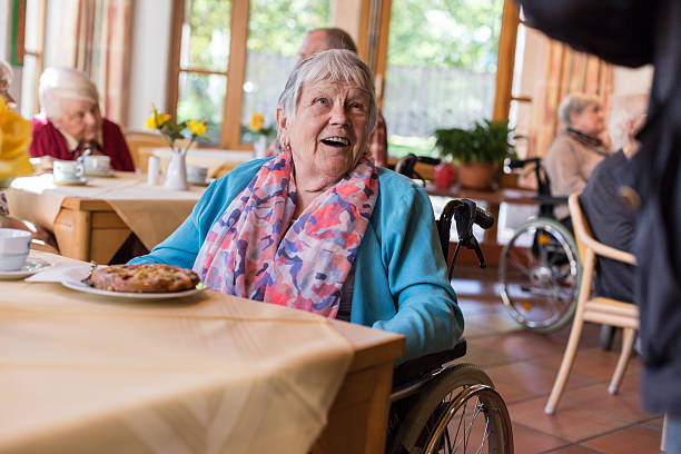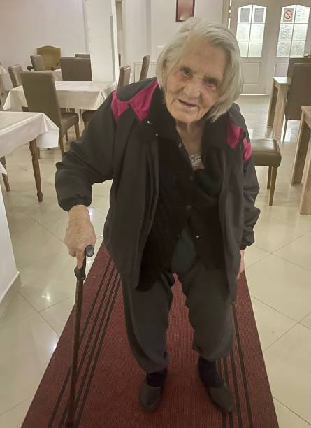 Aan een tafel in het midden zat een oudere vrouw in een rolstoel. Haar handen trilden licht terwijl ze probeerde haar kalmte te bewaren en haar waardigheid te behouden.