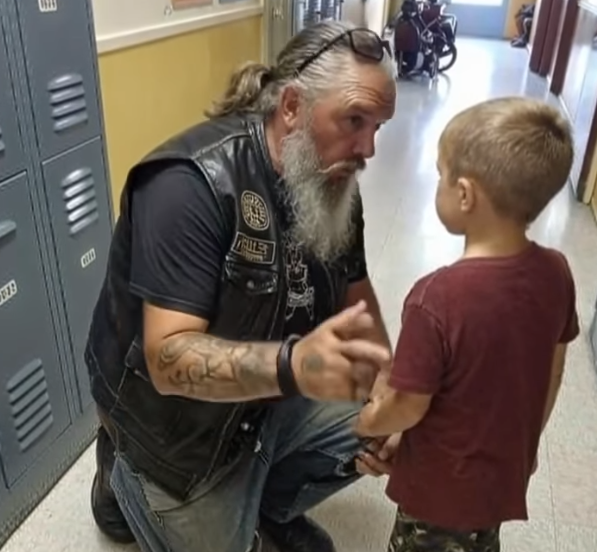Het tafereel trok haar aandacht omdat de man afweek van de vertrouwde gezichten op het plein. Zijn armen stonden vol inkt, zijn baard was vol en hij droeg een leren motorvest. Toch maakte hij een vriendelijke indruk, met een rustige glimlach terwijl hij iets toelichtte.