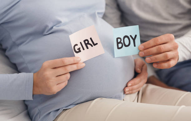 Gender reveal concept. BOY and GIRL cards in man’s and woman’s hands near pregnant belly, closeup