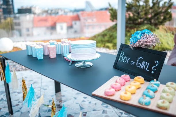 Gender reveal party sweet treats and decorations.