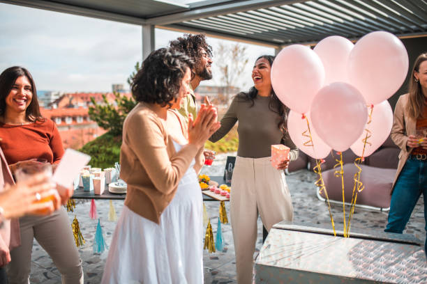 A joyful diverse group of adults gather outdoors for a gender reveal party, surrounded by pink balloons indicating a baby girl. The scene features casual attire, laughter, and festive decorations.