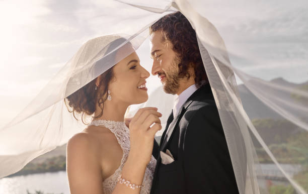 Couple, love or wedding dress veil after marriage event, ceremony or union in nature environment. Smile, happy or trust man or woman or bride and groom bonding after romance celebration by water lake