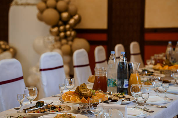Elegant wedding reception setup featuring a long table covered with white linens, glassware, plates with appetizers, and gold balloon decorations in a banquet hall.