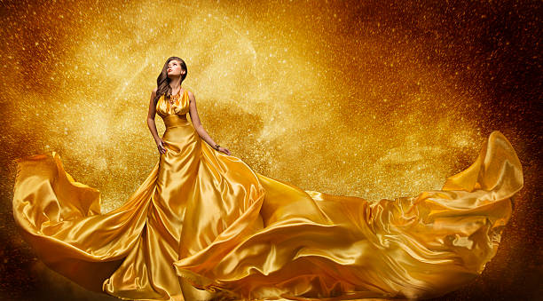 Gold Fashion Model Dress, Woman In Golden Silk Gown Flowing Fabric, Beautiful Girl on Stars Sky looking up