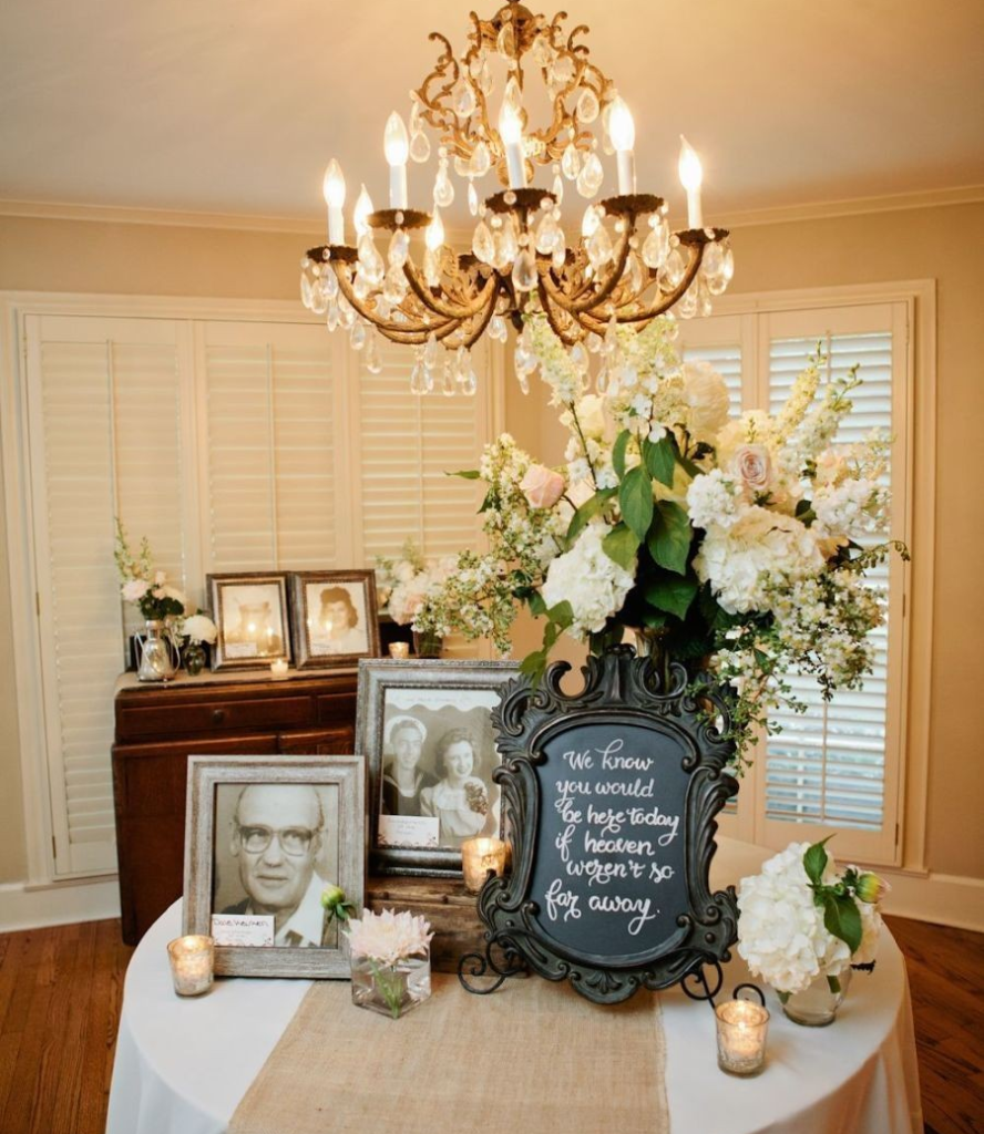 Eén idee was om een gedenktafel te creëren bij de ingang van de receptie, waarop foto’s van overleden dierbaren, inclusief de overleden echtgenoot, zouden staan.