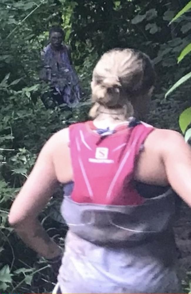 Het leek aanvankelijk een normale foto van Kay die door de struiken over een modderig pad liep. Kay deelde de foto op Reddit met de tekst: “Deze foto is gemaakt door mijn gangmaker.” Ze voegde eraan toe: “Kijk naar de persoon op de foto links van mijn hoofd.