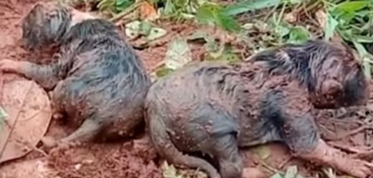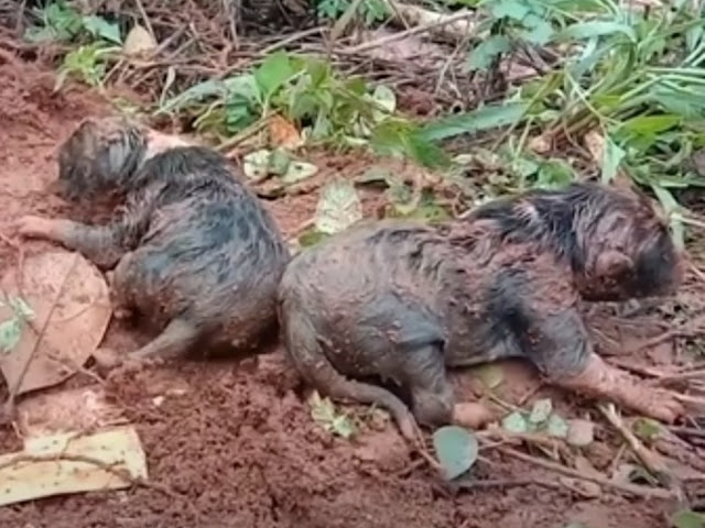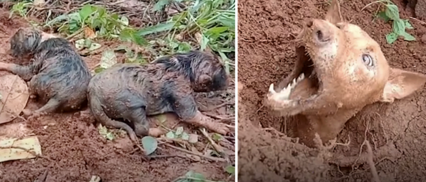 Vlak bij haar lagen twee piepkleine puppy’s half verscholen onder een laag modder, nauwelijks zichtbaar voor het oog. Hun zwakke piepjes braken de stilte en maakten duidelijk hoe dringend snelle, maar beheerste hulp nodig was.
