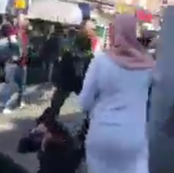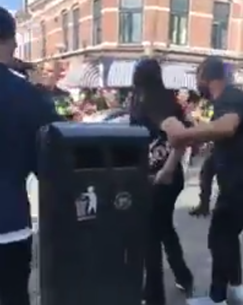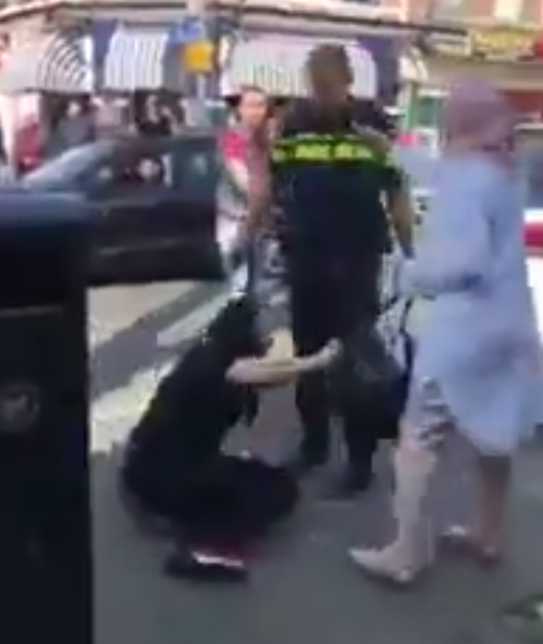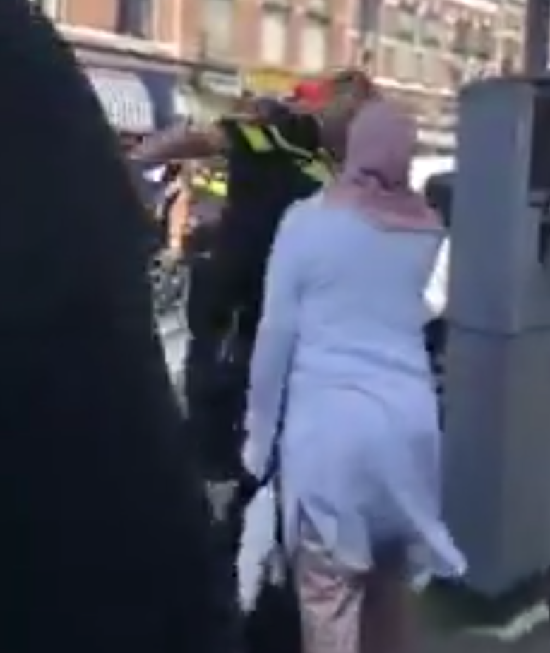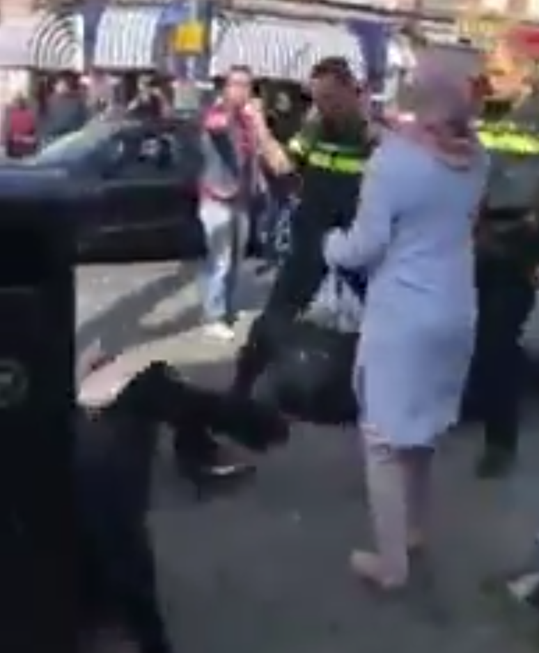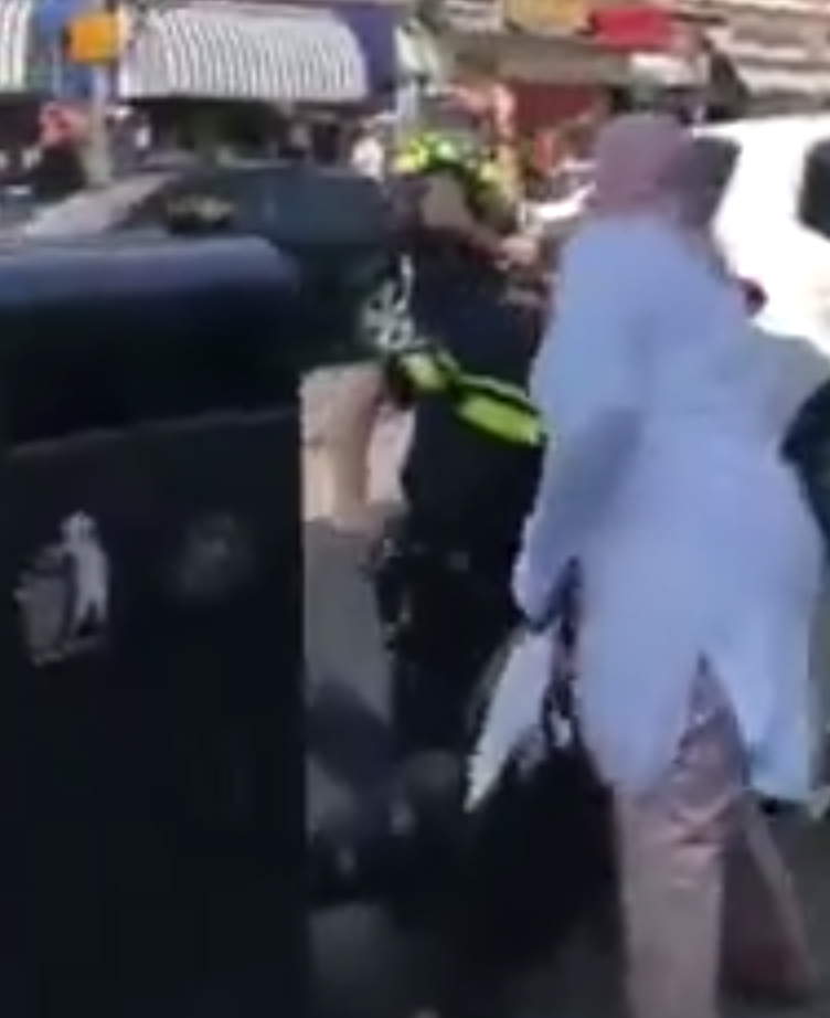 Op de beelden is te zien hoe de agent, die probeert de situatie onder controle te houden, geconfronteerd wordt met omstanders die onverstoorbaar filmen met hun telefoons. Zodra de vrouw zich krachtig verzet, neemt de spanning merkbaar toe en verandert de sfeer duidelijk in een grimmige situatie.
