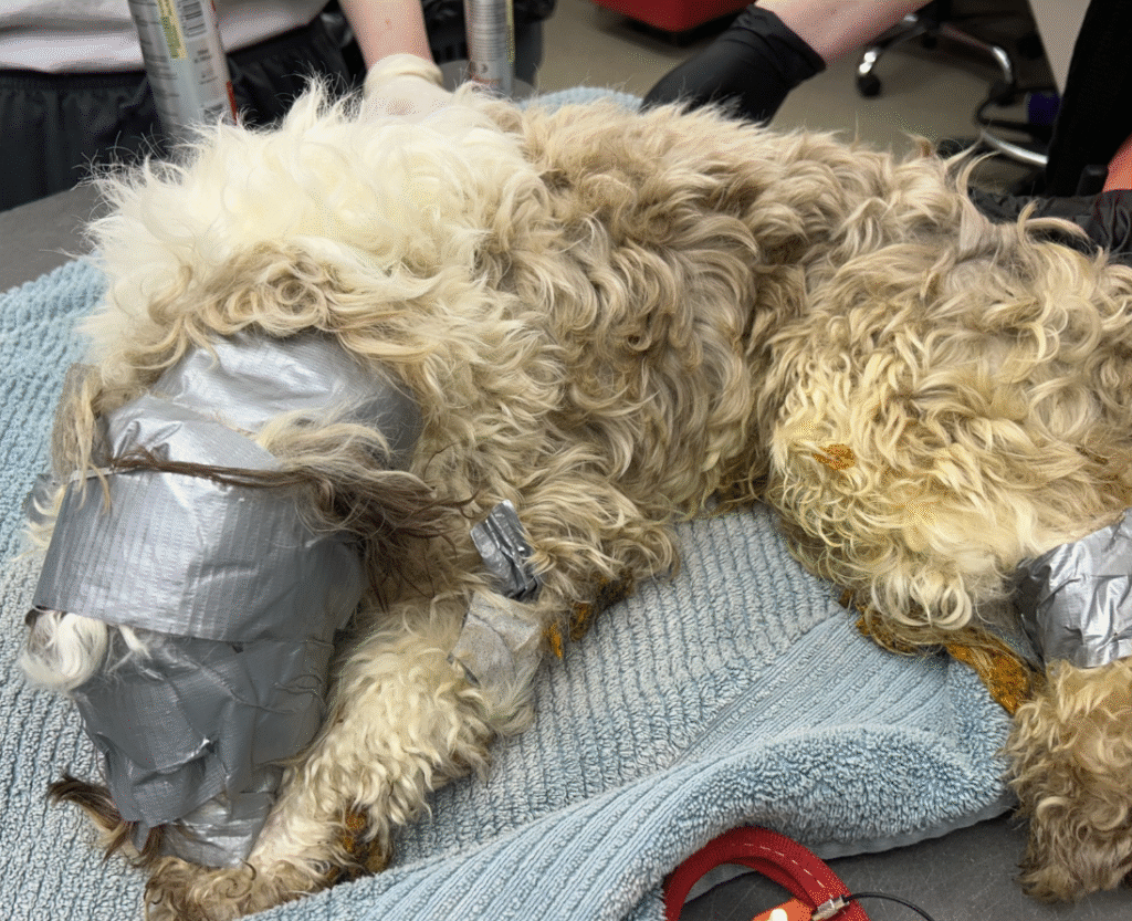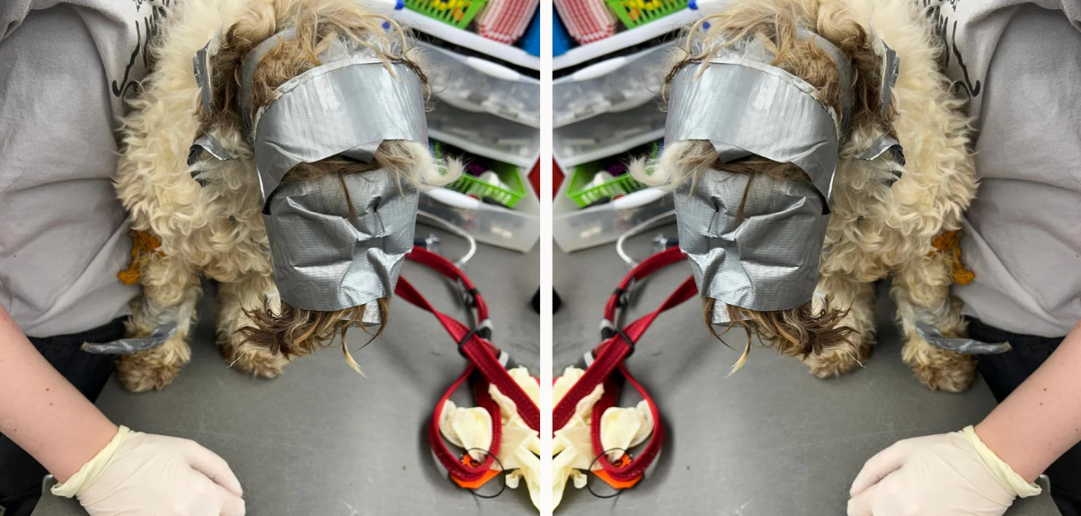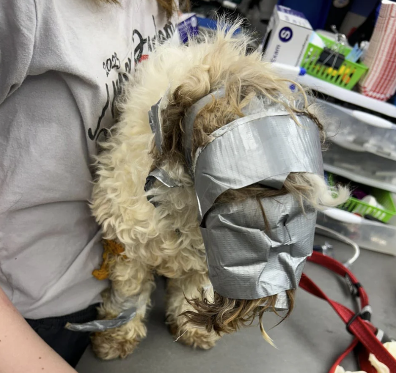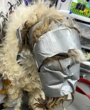 Leo, de arme hond, was op tragische wijze volledig vastgeklemd in de tape die genadeloos zijn snuit, ogen, poten en zelfs zijn staart had ingepakt, waardoor hij geen enkele beweging kon maken en geen kant op kon. In een staat van totale hulpeloosheid en benauwdheid verkeerde hij, onzeker over hoe hij zichzelf kon bevrijden en simpelweg hopen dat hulp snel zou arriveren, terwijl zijn hart sneller klopte en zijn ademhaling steeds moeizamer werd.