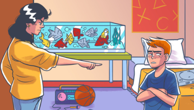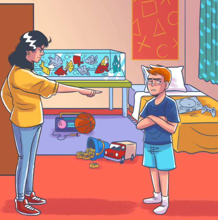Stel je de afbeelding voor: een moeder die haar zoon berispt in een rommelige kamer, met speelgoed dat overal verspreid ligt.