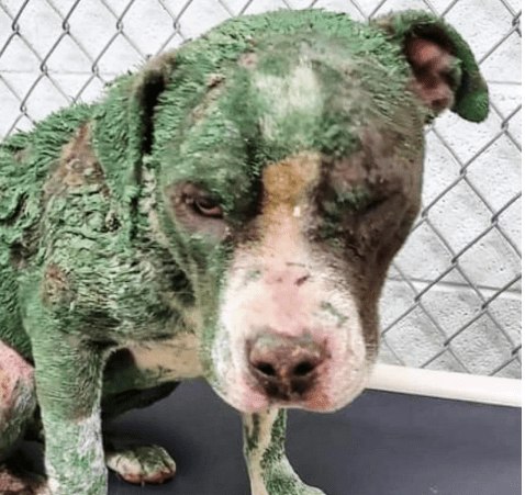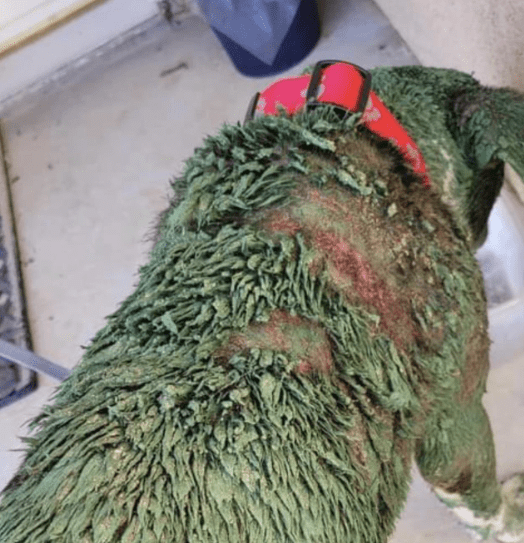 Haar vacht had door de verf een opvallende olijfkleur gekregen. Wat er precies is gebeurd, is niet bekend, maar duidelijk was dat ze snel professionele zorg nodig had.