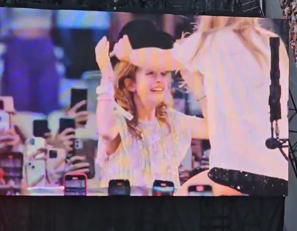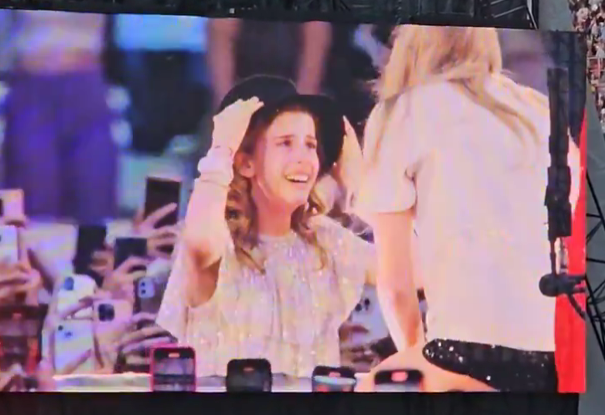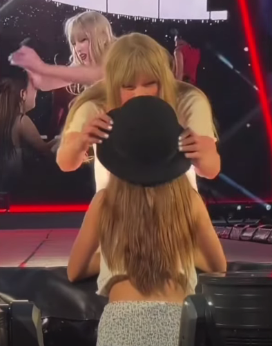 Het meisje, dat vol enthousiasme meezong, was zichtbaar ontroerd toen Swift haar benaderde, haar omhelsde, en de begeerde trilby hoed gaf.