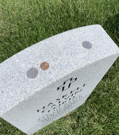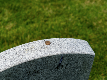 Deze gewoonte zie je vooral op militaire herdenkingsplaatsen in de Verenigde Staten. De munten blijven meestal liggen tot medewerkers van de begraafplaats ze verzamelen.