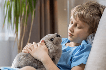 Hij zat met zijn knuffelotter in zijn armen, alsof die hem overeind hield.