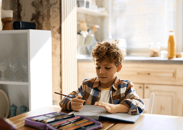 Nu zit hij aan de keukentafel met kleurpotloden, zijn tong uit zijn mond terwijl hij een dinosaurus probeert te tekenen zoals hij die zich herinnert.