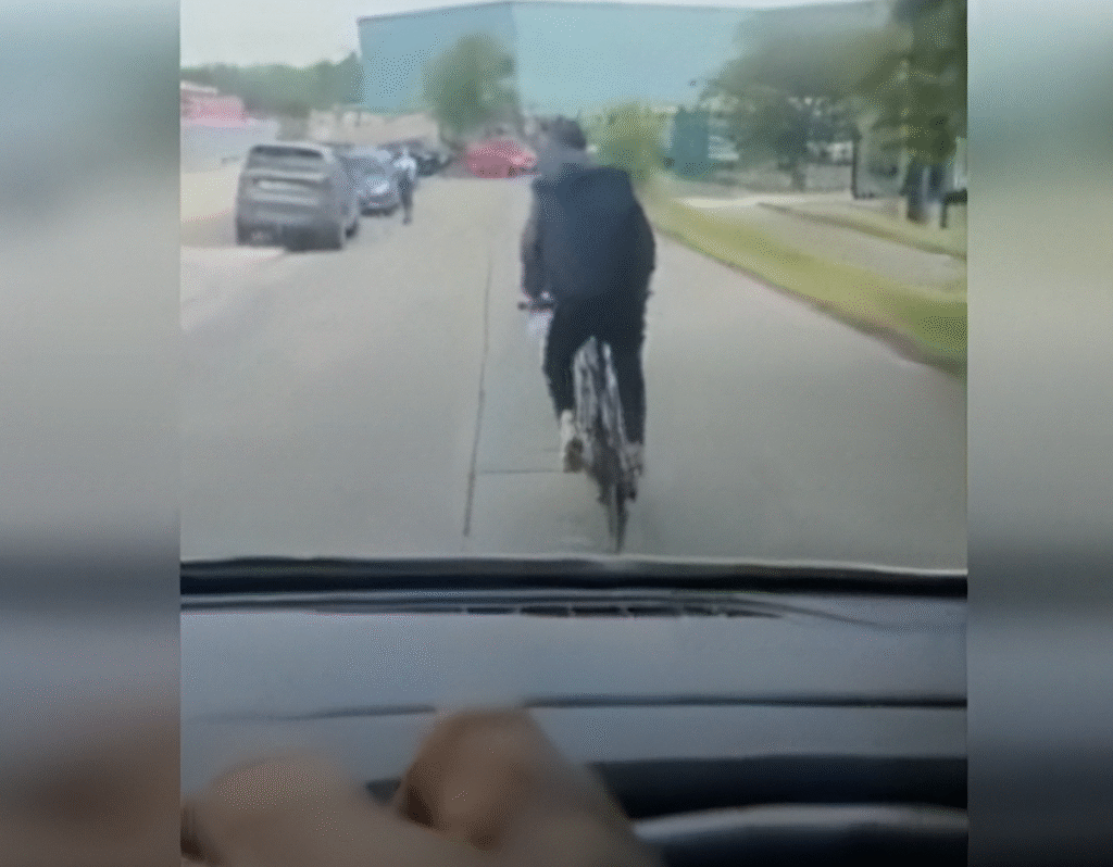 In de video rijdt een jonge wielrenner midden op de rijbaan. Direct naast de weg ligt een duidelijk zichtbaar fietspad dat in goede staat lijkt te zijn.