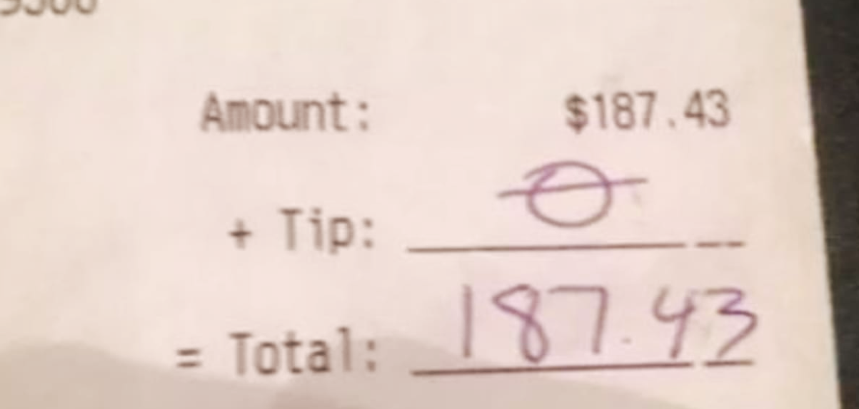 Met een fooi van $ 0 voor een bestelling van bijna $ 200 voegde de server ook een foto toe van de rekening.