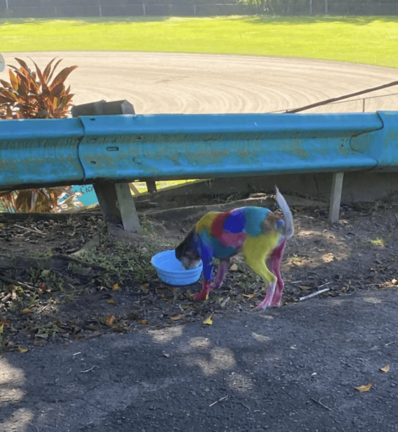 Na enkele dagen verscheen Chantal opnieuw in de buurt. Wat direct opviel, was haar uiterlijk. Haar witte en bruine vacht was bedekt met felgekleurde verf.