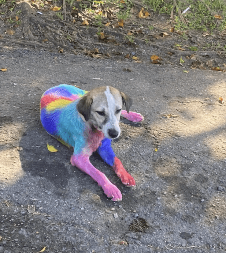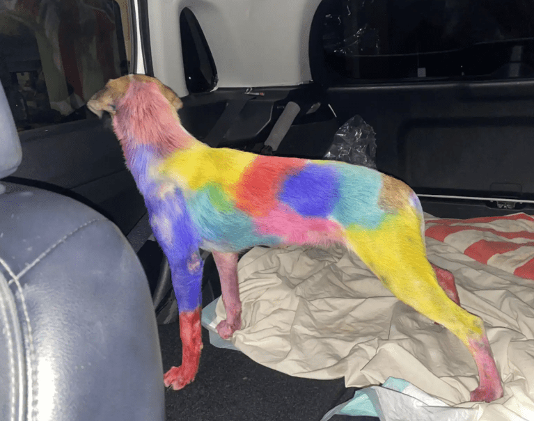 Wie zit hierachter? Vermiste straathond keert terug onder laag regenboogverf