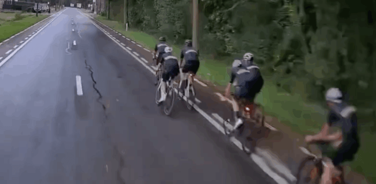 De wielrenners schrokken zichtbaar van het geluid. Sommigen maakten een gebaar en probeerden hun balans te bewaren, omdat een onverwachte prikkel bij hoge snelheid veel invloed kan hebben.