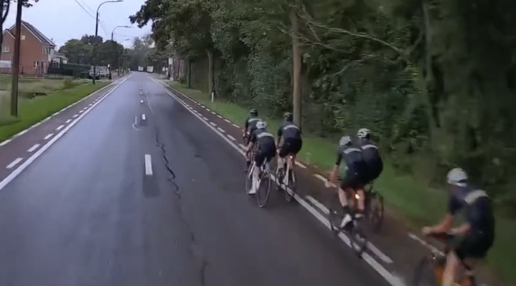 Volgens omstanders gebeurde er onlangs een opvallend moment op een rustige weg. Een groep wielrenners reed breeduit, terwijl een vrachtwagen al langere tijd achter hen bleef rijden.