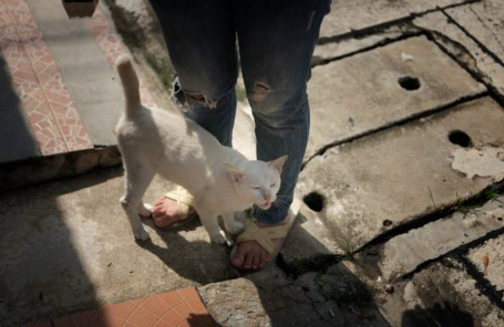 Veel katten volgen hun verzorger rustig door het huis.