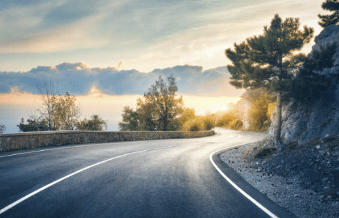 De bergweg liep door een dicht naaldbos en er was bijna niemand onderweg.