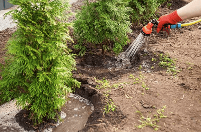Ik liet drie grote, snelgroeiende coniferen plaatsen, zorgvuldig gekozen en precies binnen de juridische grenzen geplant.