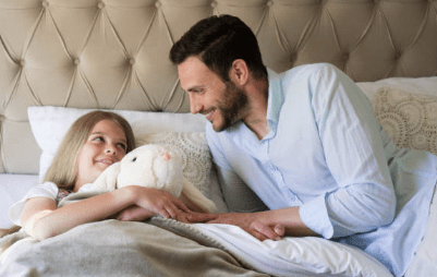Later zat Mees naast zijn dochter op bed, zijn handen voorzichtig op het dekbed gelegd alsof het teer was.