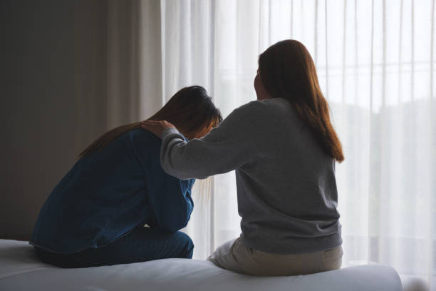 In een rustgevende omgeving, omringd door zachte geluiden en kalmerende kleuren, legt een vrouw liefdevol haar warme hand op de schouder van haar vriendin. Met een bemoedigende glimlach spoort ze haar vriendin aan om moedig en sterk te blijven, terwijl ze haar geruststelt dat ze altijd voor haar zal klaarstaan, wat er ook gebeurt.